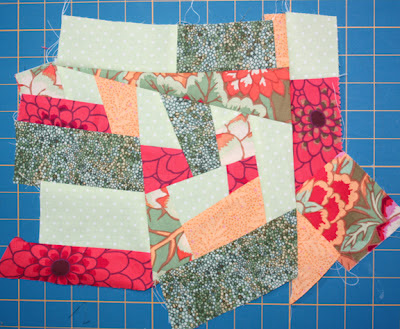 I found the third fabric and loved the orangey-red paired with the mint and sage greens, so I looked for that color in my stash. Only after finishing the block did I realize that its colors were similar to my tomato red block!