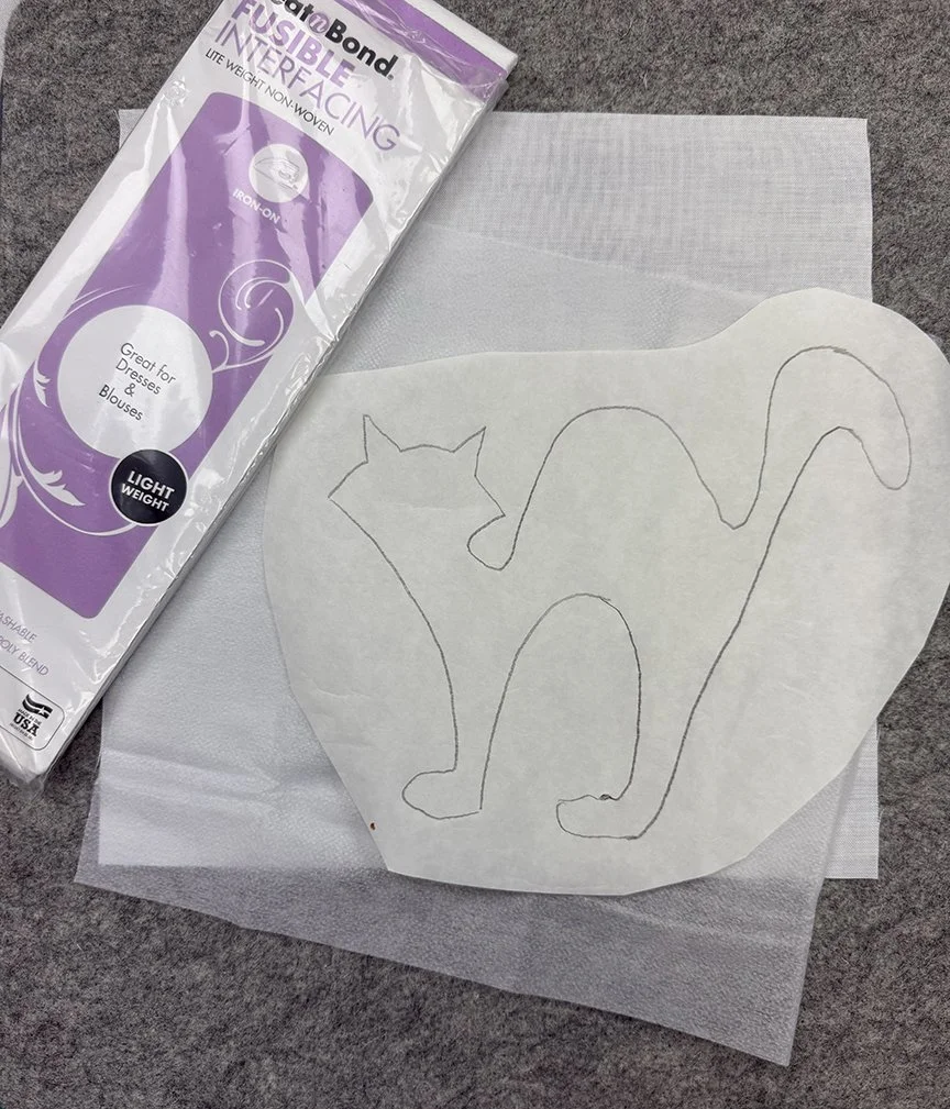 If you look at my blocks for this week, I used a pretty light background fabric. I did that because I wanted the black cat and black witch's hat fabrics to show up, but it also means those black strips might show through! Here's how to fix that. Before adhering the fusible web to with the traced shape to your background square, adhere a piece of fusible interfacing (I used HeatnBond Lightweight Fusible Interfacing). This makes the fabric more opaque and reduces the likelihood that the strips will show through.